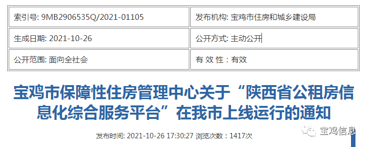 为扎实推进“我为群众办实事”主题实践活动,落实省住房和城乡建设厅《关于全面推进公租房申请审核“一网通办”工作的通知》(陕住建发〔2019〕1352号)要求,“陕西省公租房信息化综合服务平台”将于2021年11月1日起在我市正式上线运行,届时符合条件的保障对象可通过该平台实现公租房申请“掌上办”“网上办”,现将有关事项通知如下: