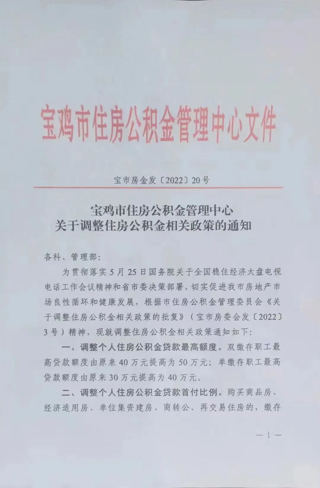 为贯彻落实5月25日国务院关于全国稳住经济大盘电视电话工作会议精神和省市委决策部署,切实促进我市房地产市场良性循环和健康发展,根据市住房公积金管理委员会《关于调整住房公积金相关政策的批复》(宝市房委会发〔2022〕3号)精神,现就调整住房公积金相关政策通知如下: